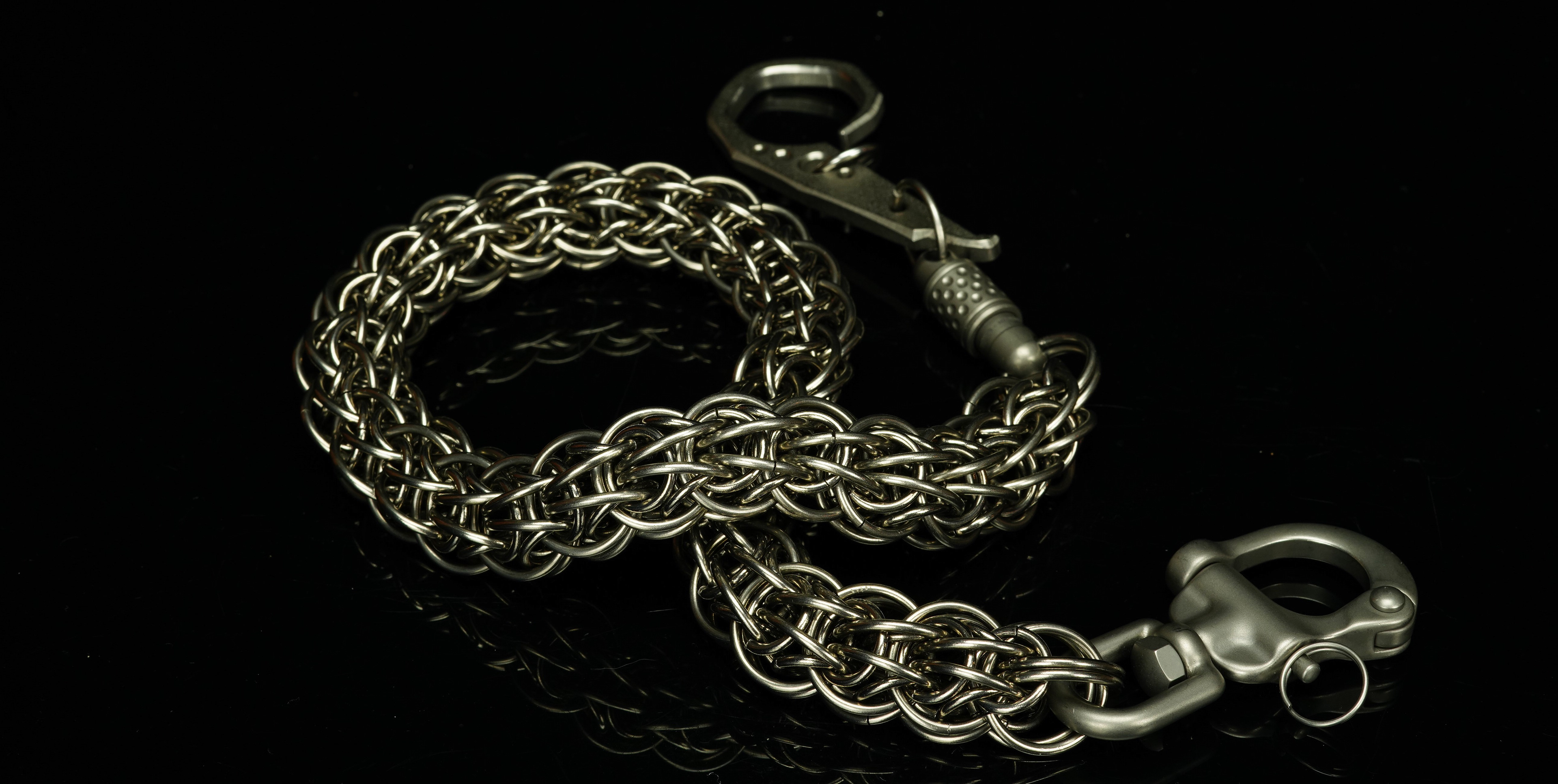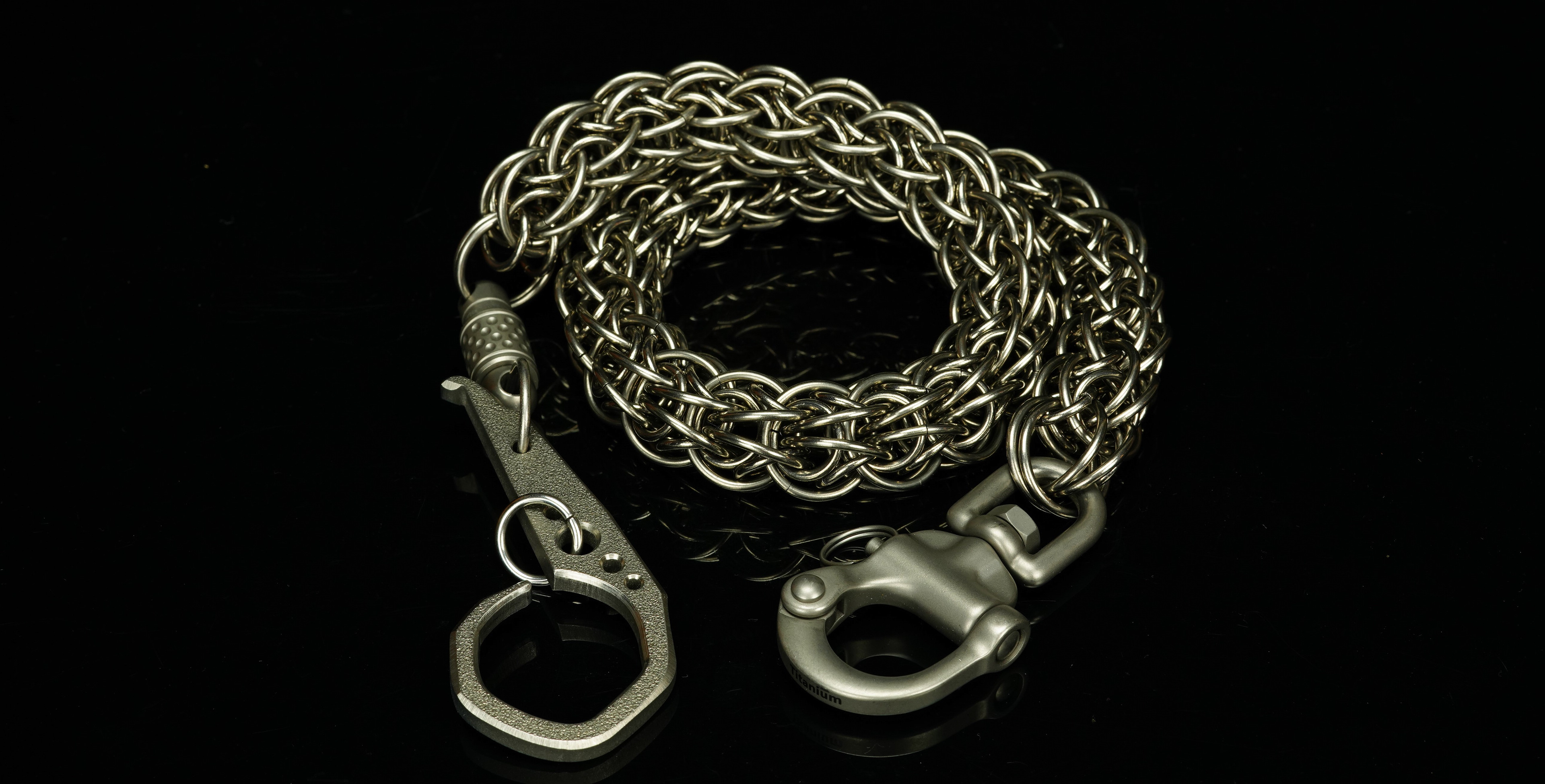 A weave of my own design- unnamed. Grade III Titanium chain with Titanium snap shackle and custom clip by OOAKForge.